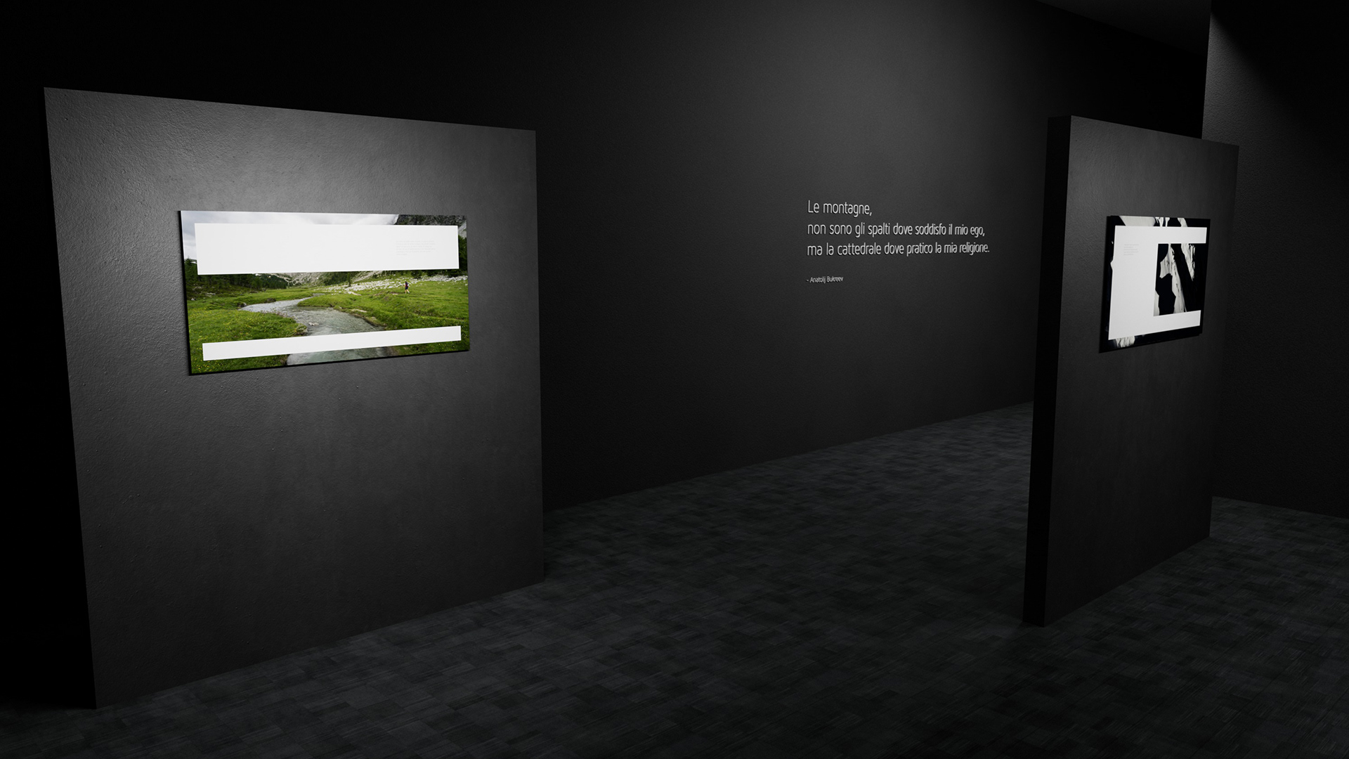 Sono inoltre presenti due citazioni posizionate in rilievo sulle pareti: la prima, “Le montagne non sono gli spalti dove soddisfo il mio ego, ma la cattedrale dove pratico la mia religione.” di Anatolij Bukreev, si trova a metà del percorso fotografico; mentre la seconda, “Vivere tutto per non dover raccontare ogni cosa. Che si deve sempre tenere qualcosa che sia soltanto nostro.” di Chiara Guglielmina, è posizionata all’uscita della mostra, come chiusura del viaggio.