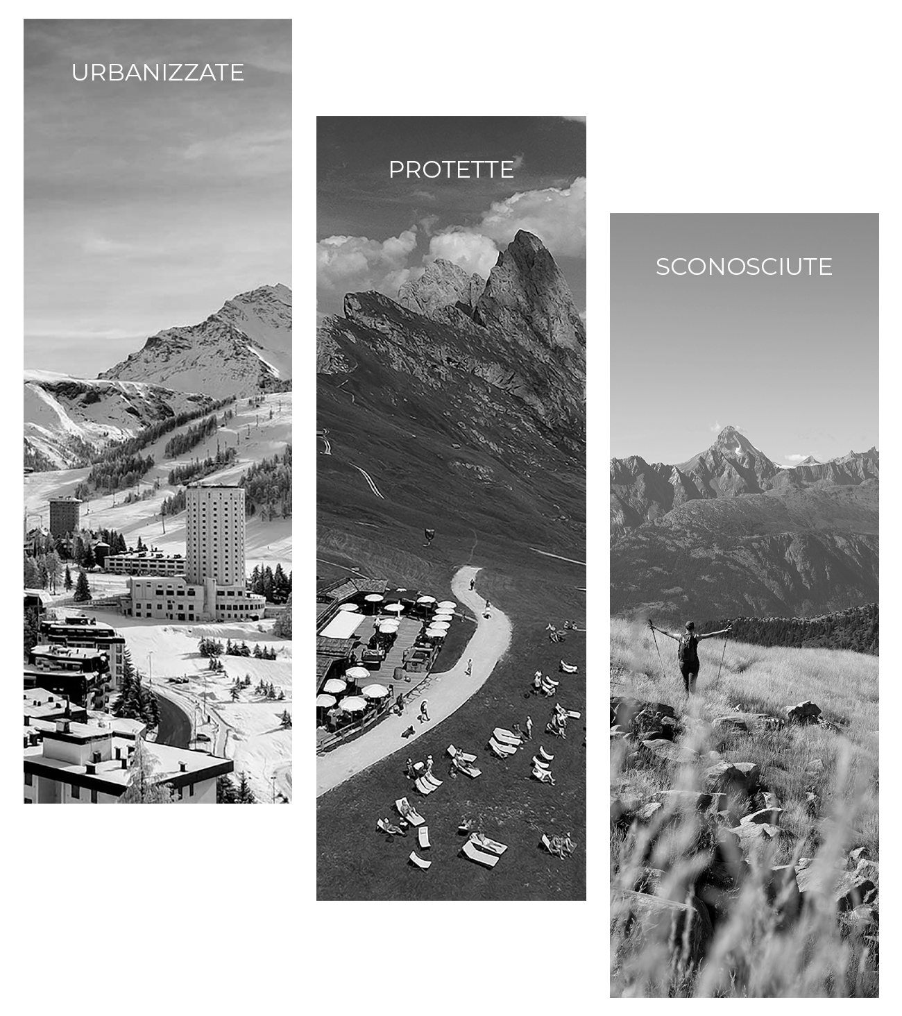 Ogni manifesto presenta l’immagine al vivo di una montagna iconica della zona, “oscurata” mediante lo spazio negativo che lascia posto al body copy. Nell’angolo superiore sinistro è invece posizionato un unico blocco contenente il titolo e sottotitolo della mostra fotografica, oltre al luogo e al periodo di esposizione.
